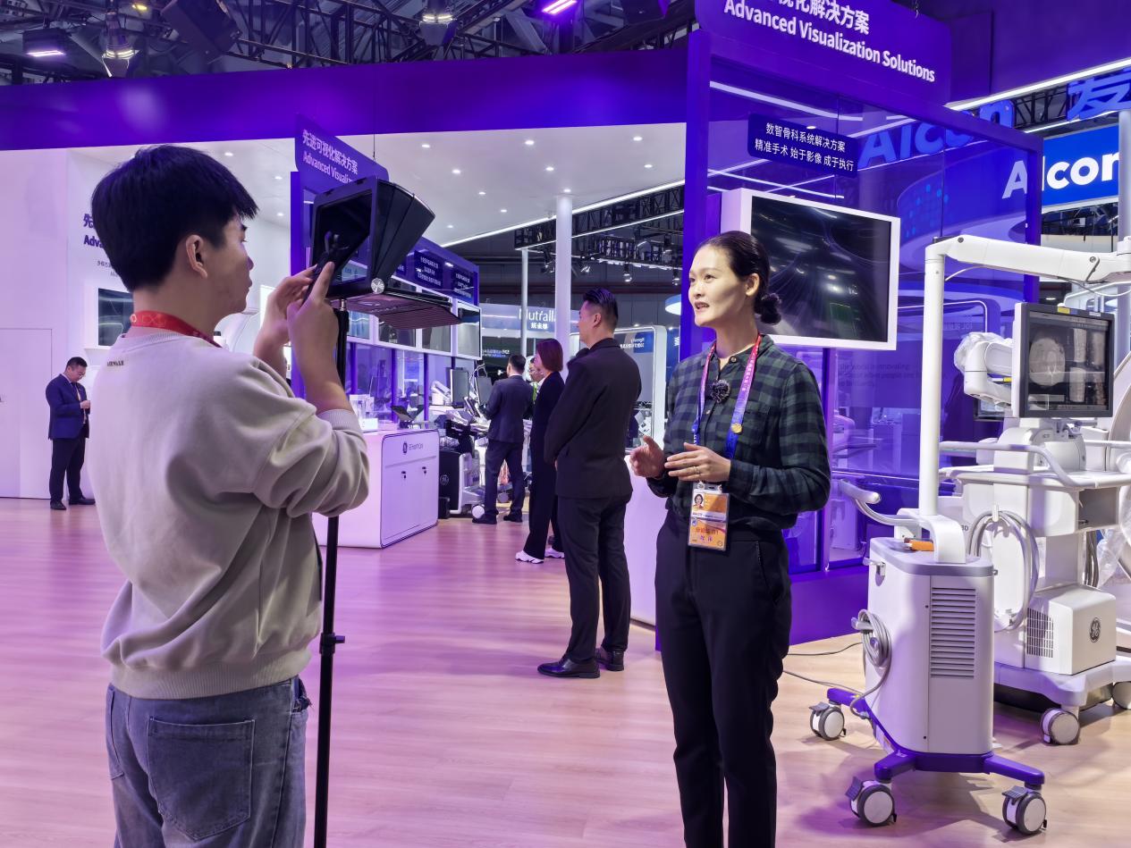 图为在进博会展会上正在进行采访责任的记者。中国经济网记者魏金金/摄