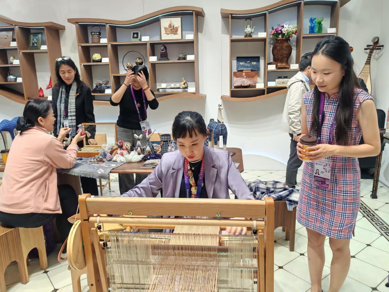 图为在进博会新闻中心非遗客厅记者们在体验织布。中国经济网记者杨秀峰/摄
