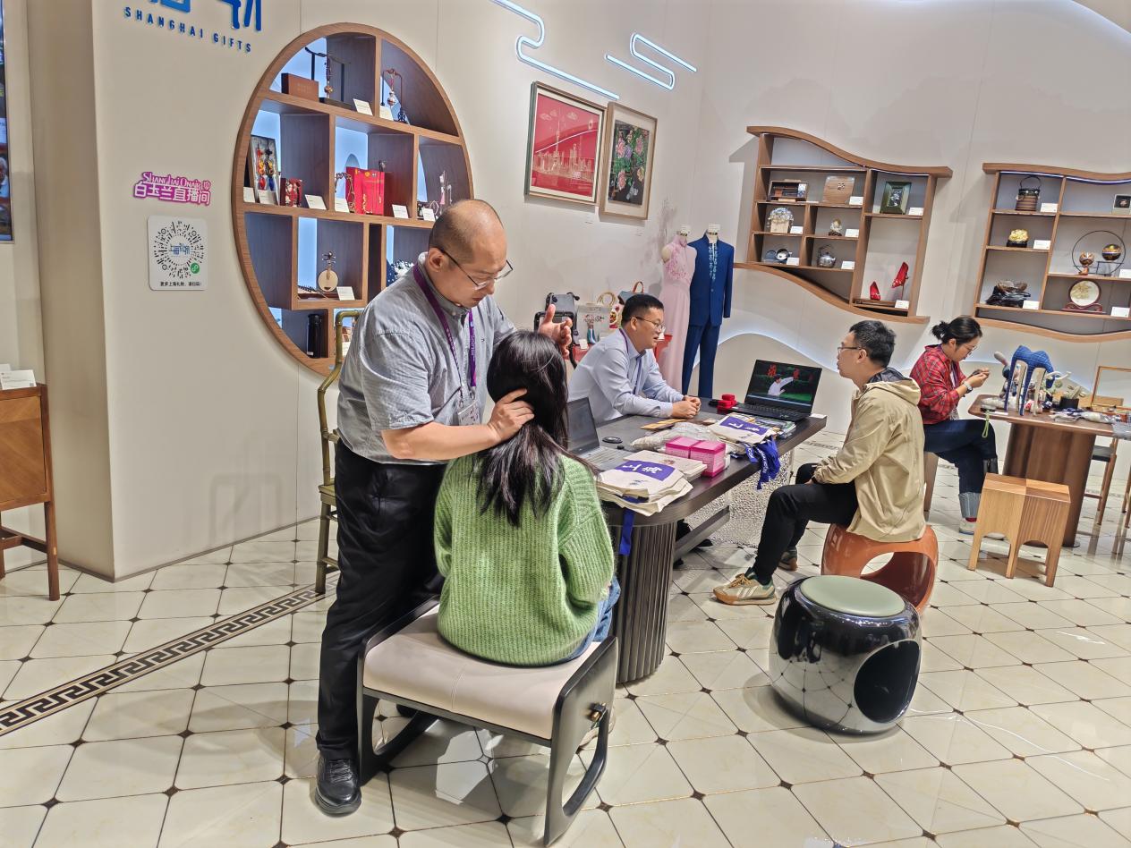 图为在进博会新闻中心非遗客厅记者们在体验中医理疗。中国经济网记者杨秀峰/摄